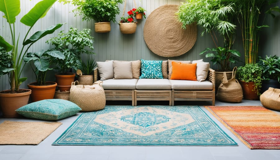 Size matters significantly in outdoor spaces. Measure your area carefully, allowing for at least 18 inches of space between the rug’s edge and your furniture arrangement. This creates a balanced, welcoming look while ensuring your eco-friendly choice makes the impact you’re hoping for.