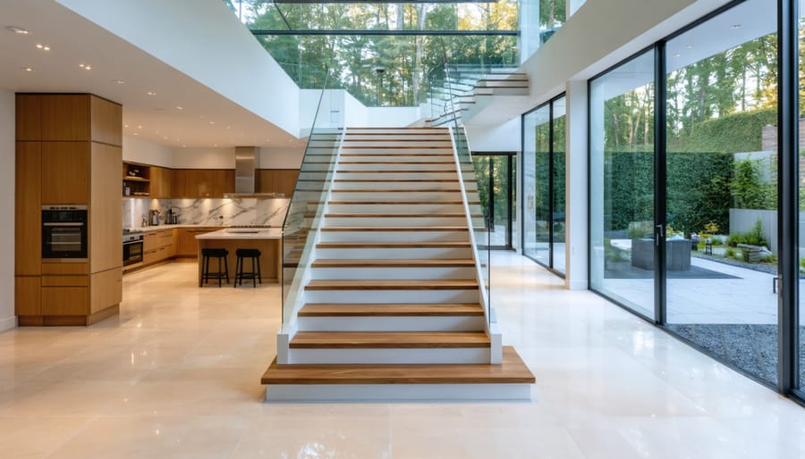 Matching interior finishes with architectural elements enhances the sense of luxury. Consider: a custom staircase of white oak with a glass balustrade that runs the full height of the home. Beneath it, large-format porcelain tile continues across the floor, the same tile stepping into a spa-inspired ensuite.