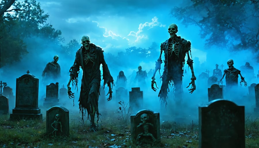 Consider motion-activated lights that trigger when someone approaches – this creates startling moments and conserves battery life. For a fog-machine setup, position the machine slightly behind your zombies and aim it low to the ground. The fog will create an atmospheric graveyard effect while concealing light sources.